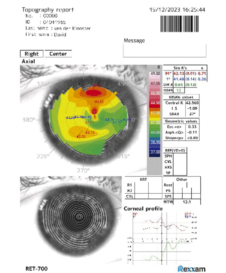 Mapas coloridos em Axial, Tangencial, Elevação, Refrativo.