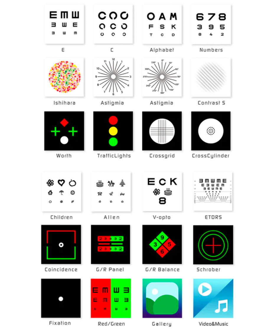 🔢 Múltiplos testes integrados: gráficos com letras e números, testes de Ishihara, sensibilidade ao contraste, estereopsia, entre outros.